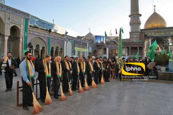 خادمان و جاروکشان حرم حضرت عبدالعظیم حسنی در آیین تعویض پرچم گنبد حرم حضرت عبدالعظیم حسنی